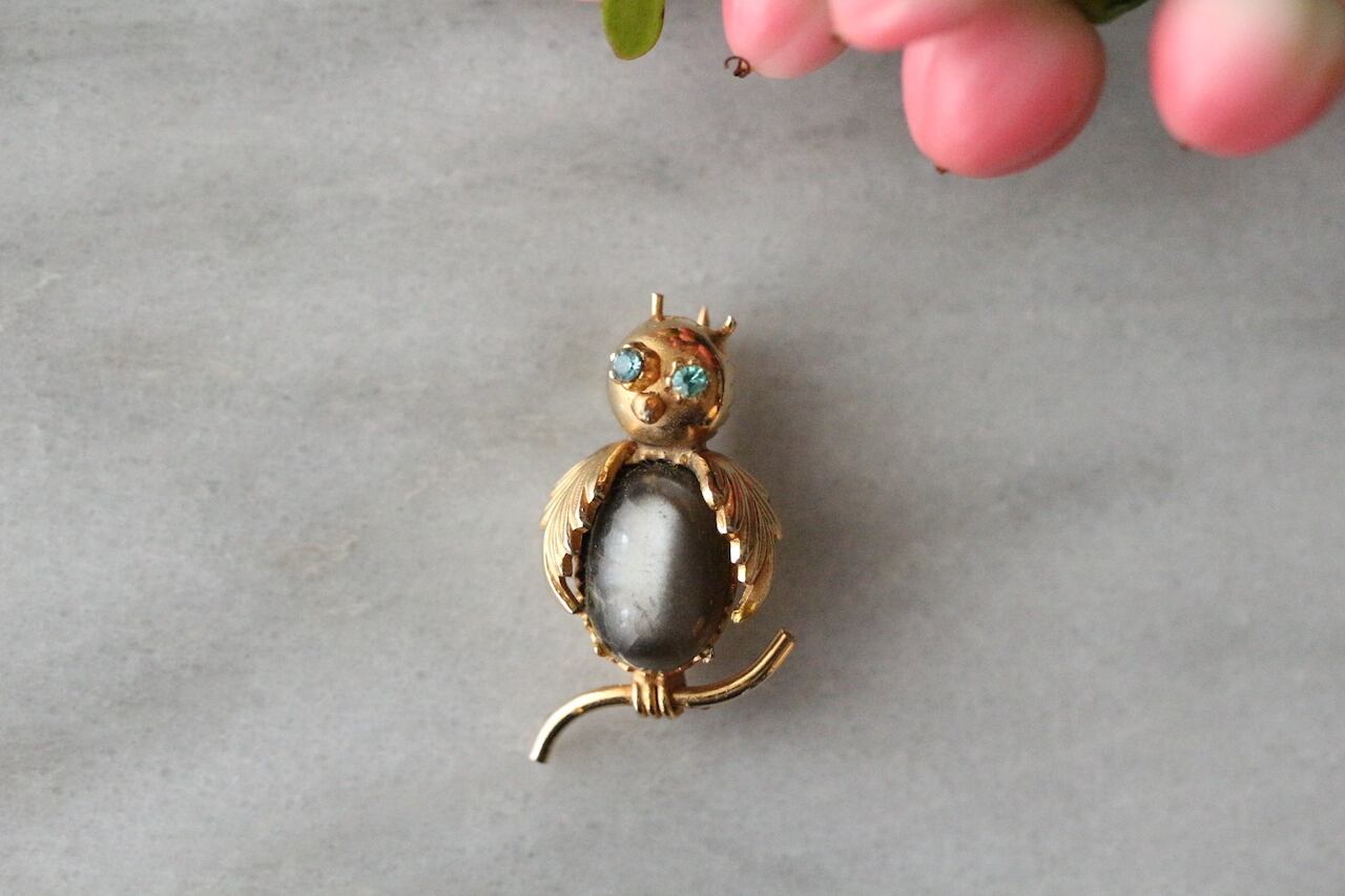 ヴィンテージ・”jelly belly”・ディアマンテ・アイズ・キュート・オウル・ブローチ