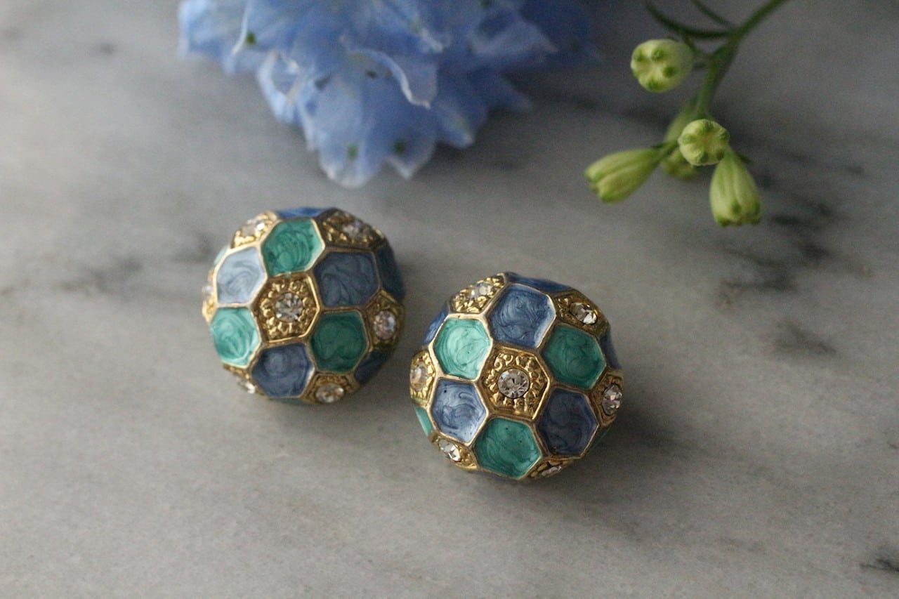 淡いブルーとグリーンの六角形のエナメルが交互に配置され、センターにはラインストーンが 煌めくフランスらしいデザインのラブリーなイヤリング。