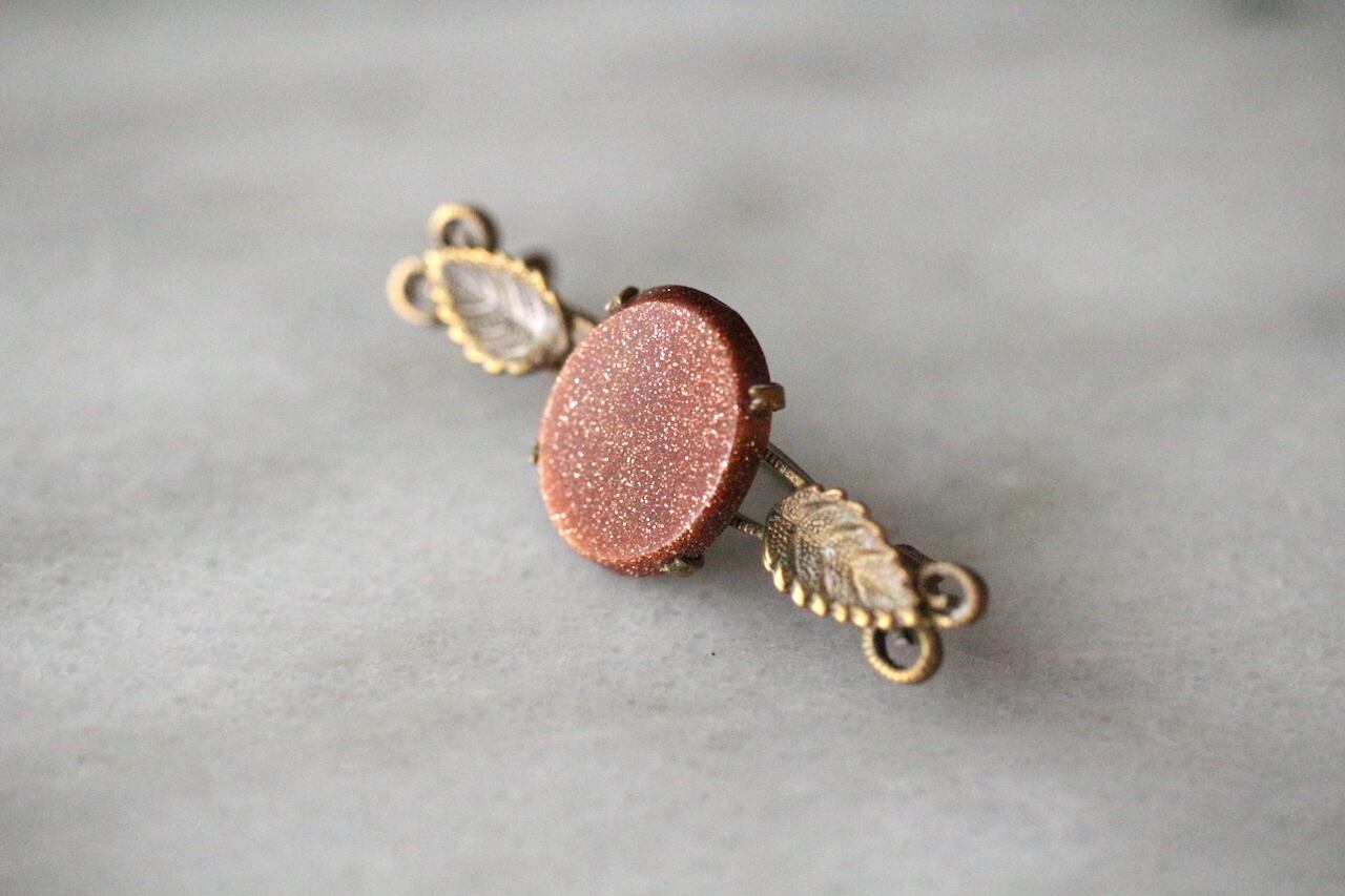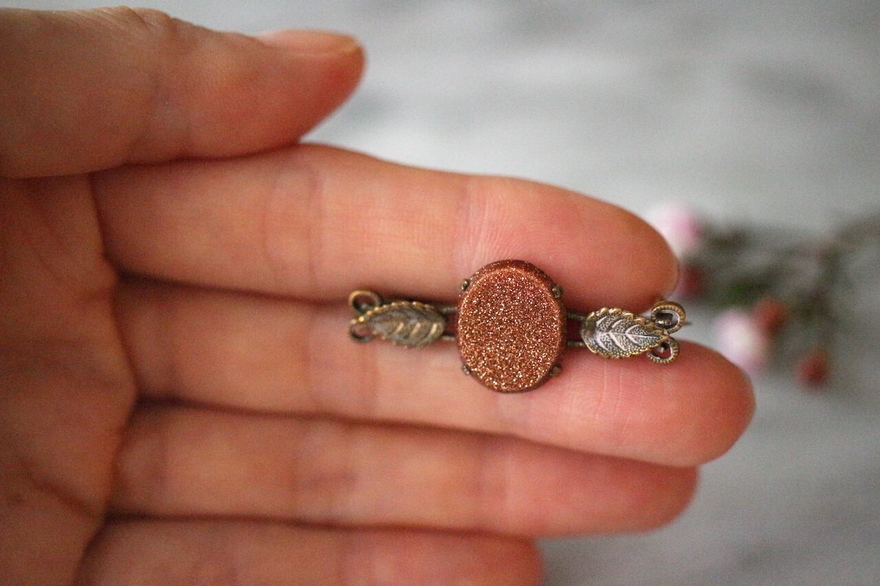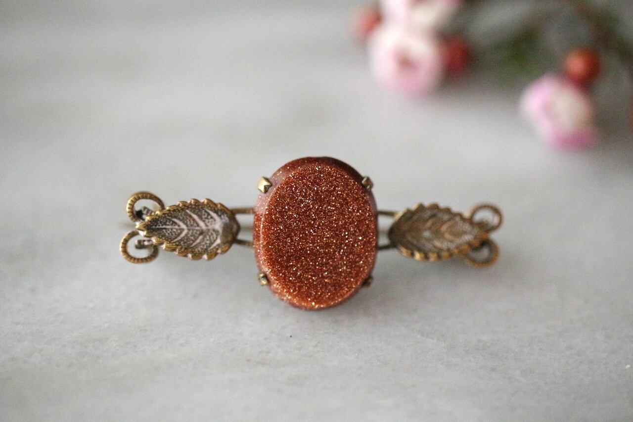 珍しいゴールドストーンはオーバル型にカットされ、左右には真鍮製の繊細なリーフを配置しています。