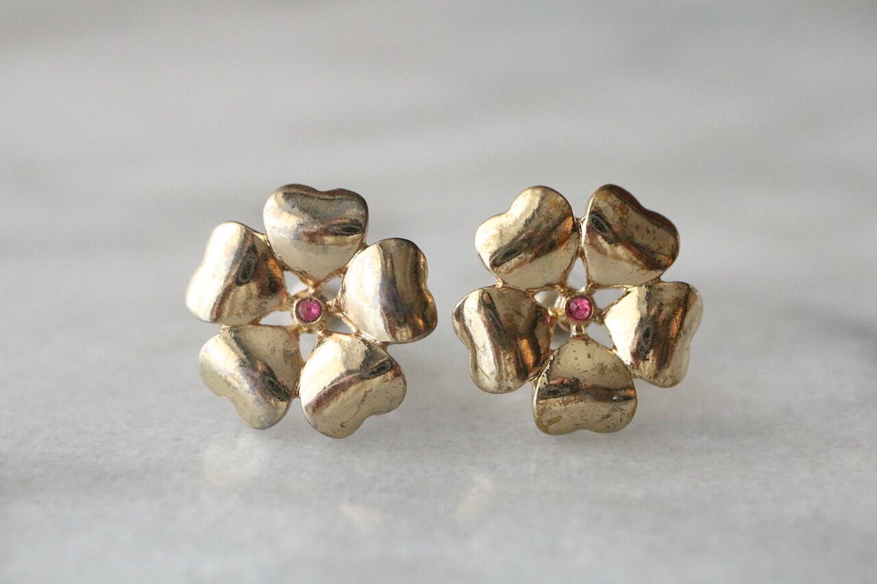 フラワーの形をした光沢感のあるポリッシュ・ゴールドトーンのピアスド・イヤリングです。花弁の中央には薄いピンク色のクリスタルがセットされています。メタルを美しく湾曲させたレリーフが光に反射して輝くシンプル・シックなビジュー。全体的に美しいヴィンテージ・コンディションです。