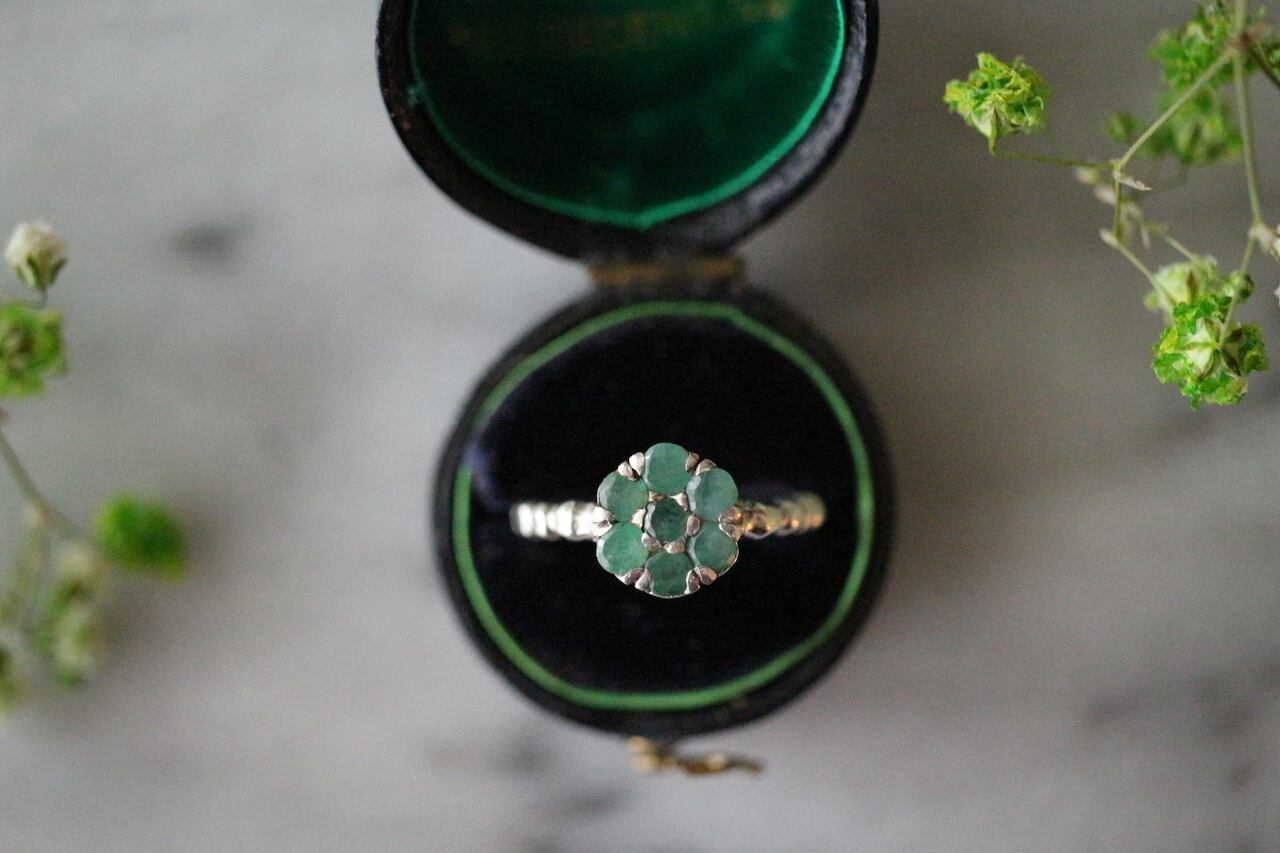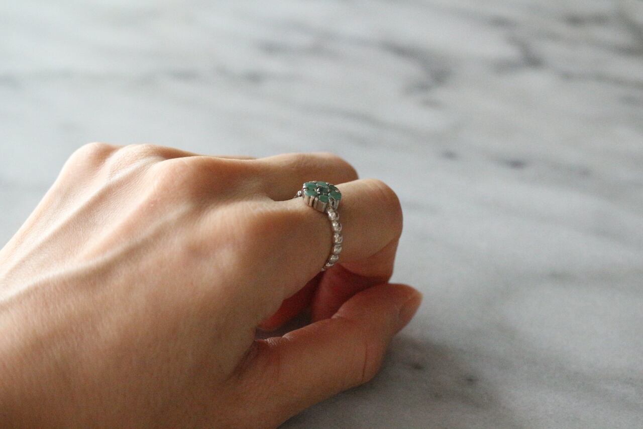 自然採掘の淡いエメラルドがクラスターしたフラワー・リングです。