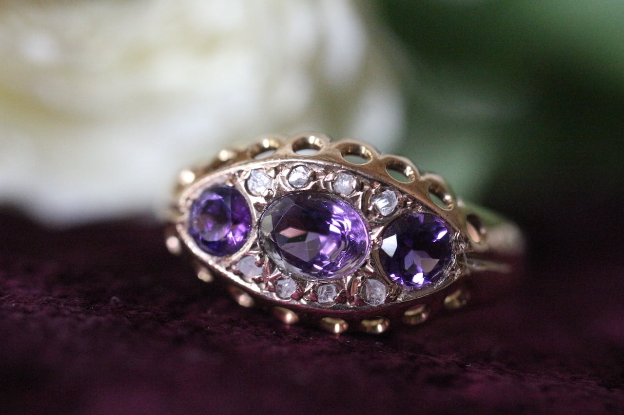 フロント部分には3石のアメジストが爪留めされ、周りに8石のダイヤモンドが埋め込まれた大変ゴージャスなアンティーク・リングです。