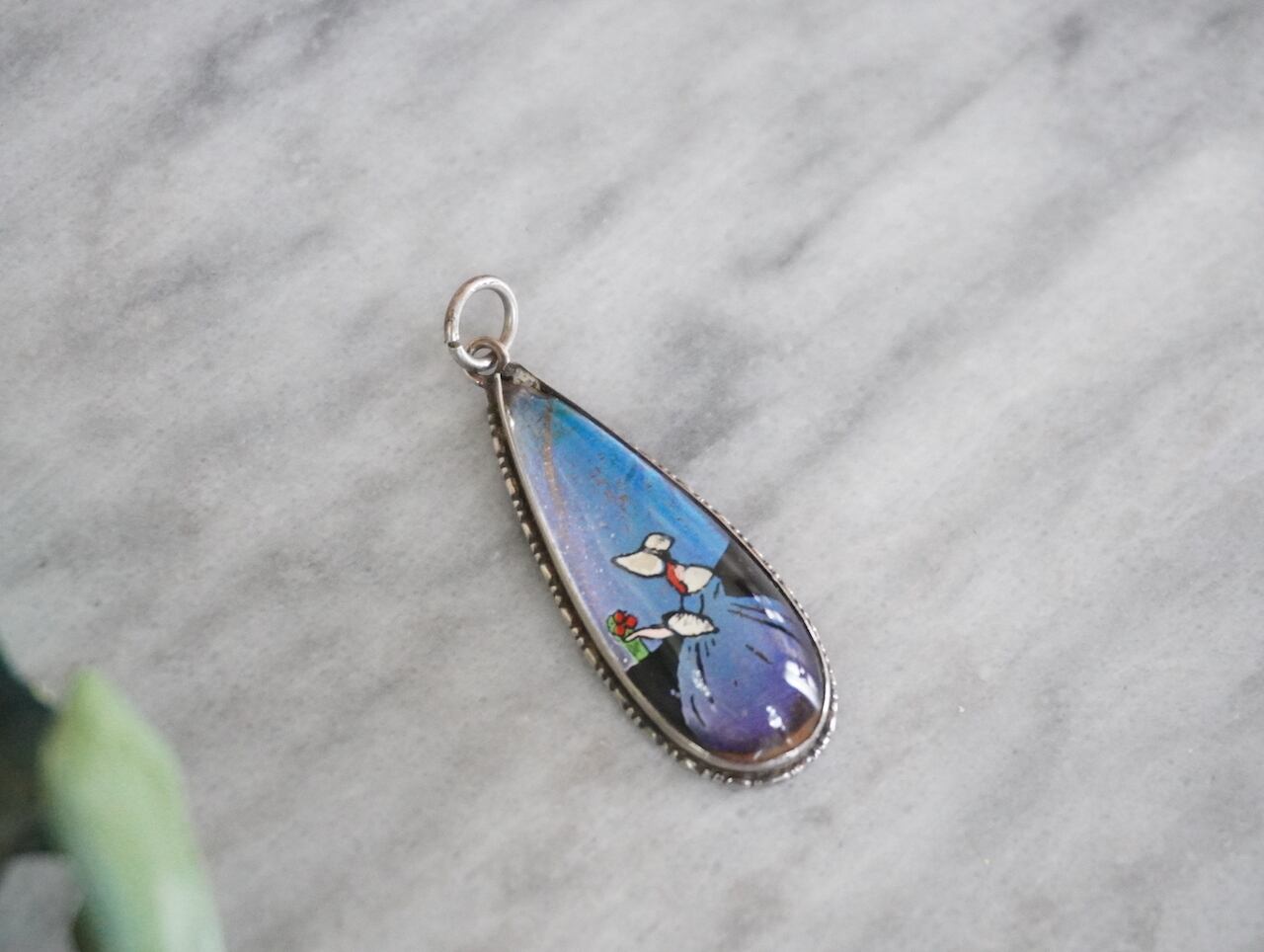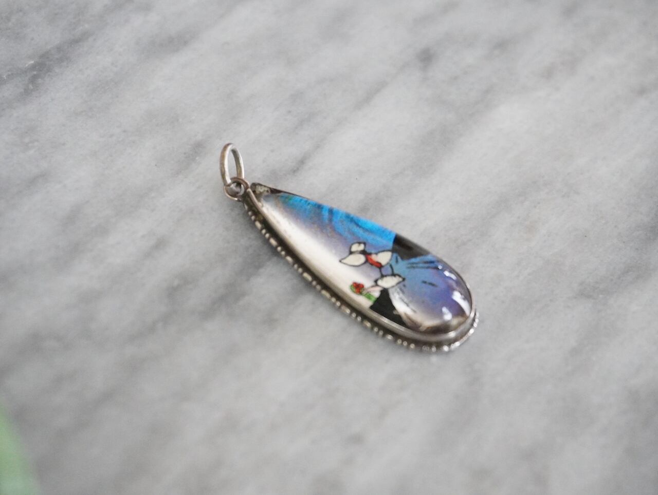 1920 年代ごろに生産されたMorpho蝶の翅を繊細に加工したペンダントです。