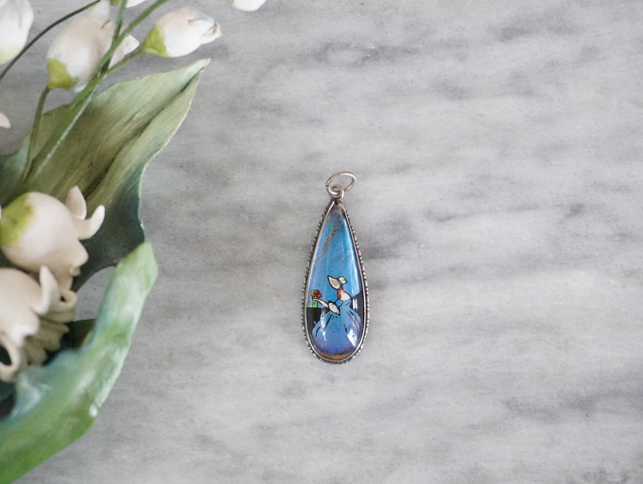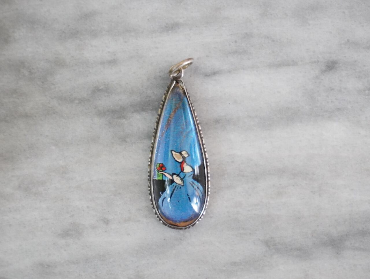 Antique 1920s TLM Victorian Lady Painted Sterling Silver Morpho Butterfly Wing Pendant