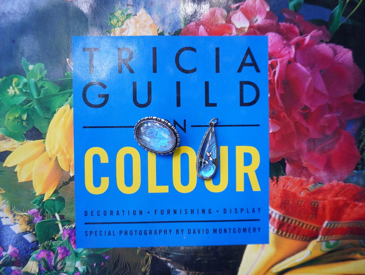 本物のバタフライ・ウィング(通常は南米のモルフォ・バタフライ)を使用して作られた豊かなブルーのアクセサリー中では、主に2種類の人気のあるデザインがありました。1.色の美しさとシンプルさを際立たせるもの(写真のタイプ)、そして、2.ガラスのカボションの内側に絵画のシルエットや輪郭を逆に描き、表面側に蝶の羽の上に置いた美しいシーンのアート・ワークです。バタフライ・ウィング・ジュエリーは、チャーム、ブローチ、ブレスレット、イヤリング、ペンダントなどが作られました。